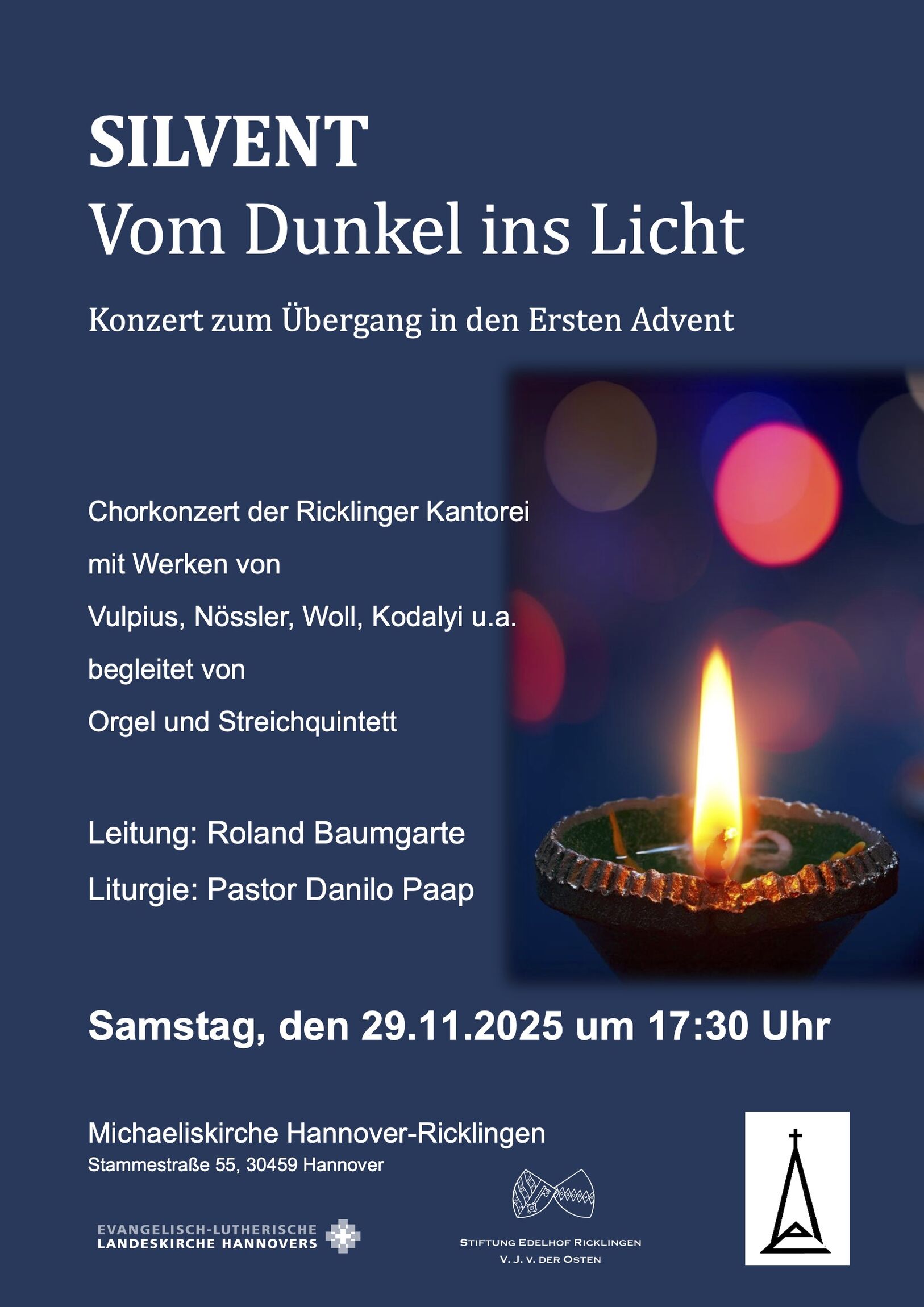 Auch in diesem Jahr wir es am Samstag, dem 29. November in der Michaeliskirche Ricklingen ein Konzert zum Übergang vom Ende des Kirchenjahres (quasi "Kirchensilvester") in den Advent geben.